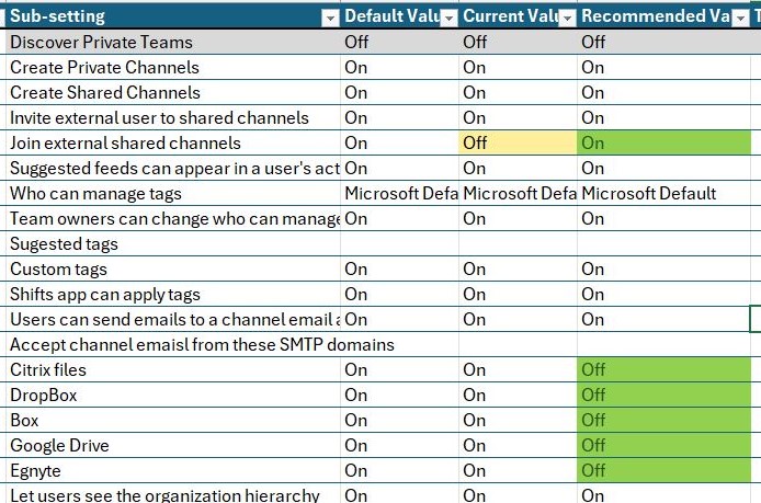 What I have right now in the various tabs of the workbooks are a series of columns that list the location of the setting in the UI, and then I have populated a column that displays the Microsoft Default value for that setting. The next two columns are then populated with the Current Value in the tenant and then the Recommended Value.